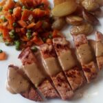 Dit vlees hoeft niet echt saus omdat het vlees op zich al fel afsmaakt, maar de saus is ook lekker bij de aardappeltjes!