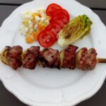 5. Maak de brochette: snij de tweede ui in vier en maak de rokken los van de ui. Rijg telkens een stukjes vlees, ui, vlees aan de brochette en bak ze mooi aan op de BBQ.
