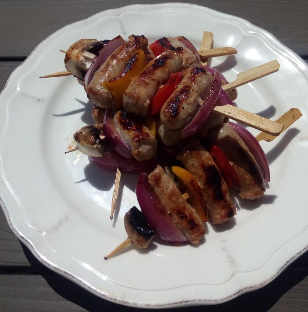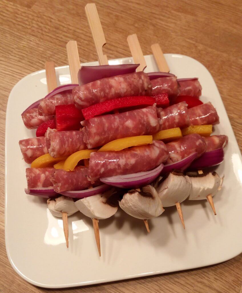 2. Maak de brochette: rijg afwisselend vlees en groentjes op een houten prikker. Gouden tip 1: zorg ervoor dat de groenten niet verder uitsteken van de worstjes, zodat tijdens het bakken alles contact heeft met de rooster van de BBQ of grillpan. Gouden tip 2: gebruik niet ronde satéprikkers, zo draait het vlees en de groentjes niet tijdens het keren.